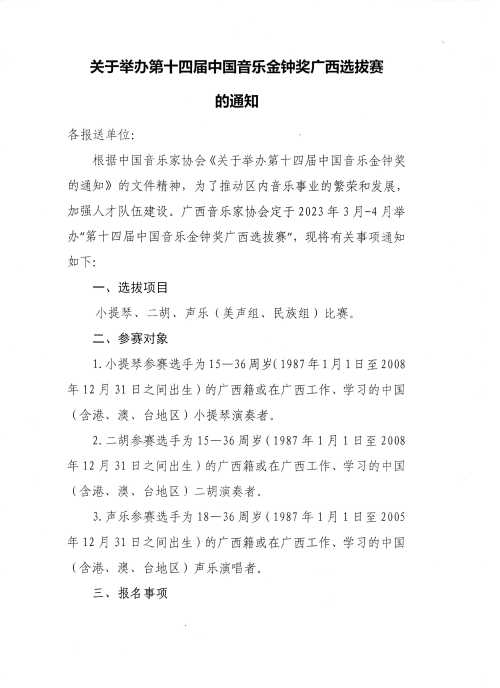 关于举办第十四届中国音乐金钟奖广西选拔赛的通知