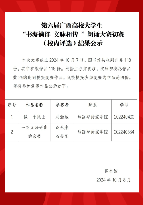 第六届广西高校大学生 “书海徜徉 文脉相传”朗诵大赛初赛(校内评选)结果公示