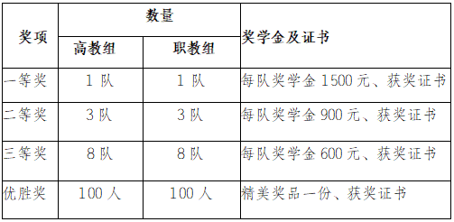1.优秀组织奖:为激励各高校积极组织学生参与主题知识竞赛活动,主办方将根据各高校的参赛人数、成绩与活动组织情况,对高教组、职教组分别进行排名,评选优秀组织奖12所(高教组、职教组各6所)。