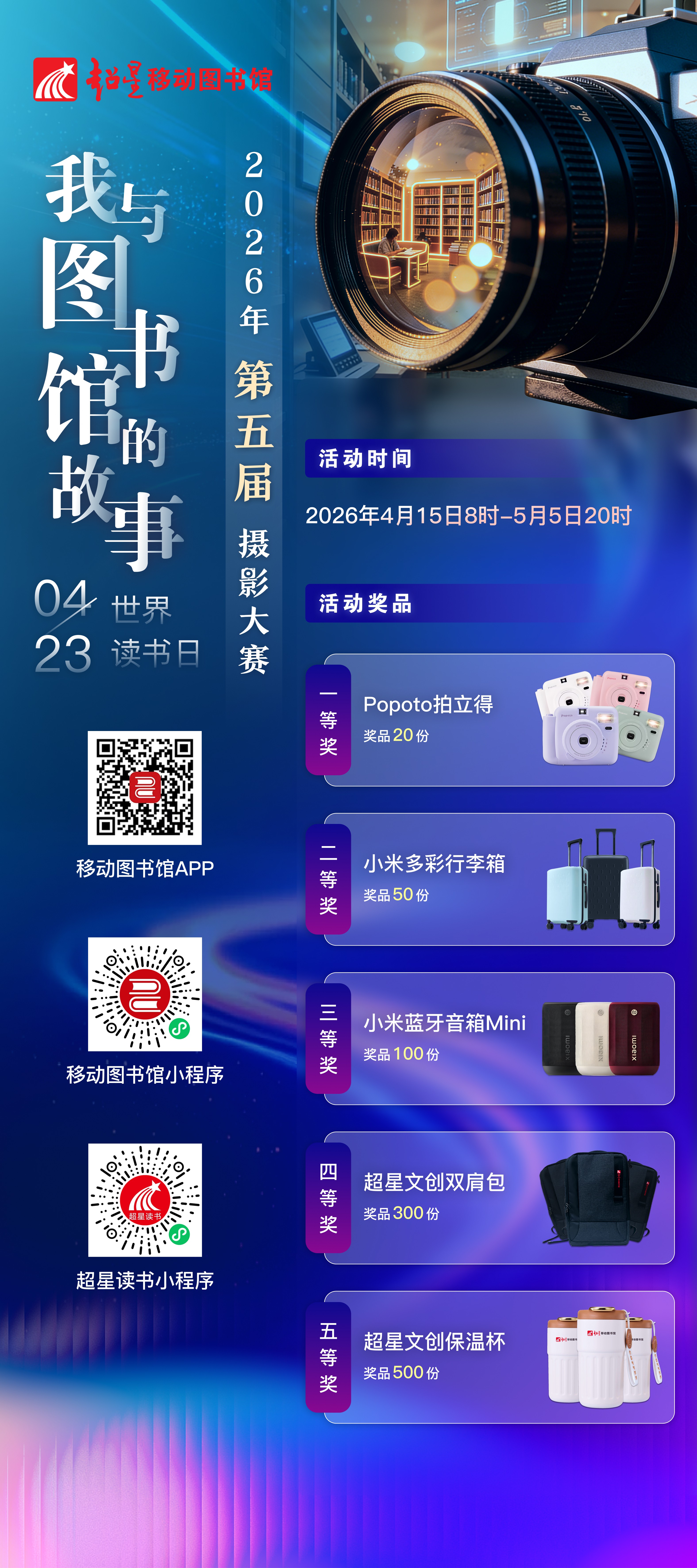 为鼓励广大师生走进图书馆、感受图书馆,值此世界读书日来临之际,现组织学生参加第五届“最美图书馆”超星移动图书馆摄影大赛。活动以“我与图书馆的故事”为主题,向广大师生征集摄影作品,旨在用镜头定格那些温暖而动人的阅读瞬间,记录读者与图书馆的故事,展现图书馆的独特魅力,记录阅读时光,传承文化薪火。