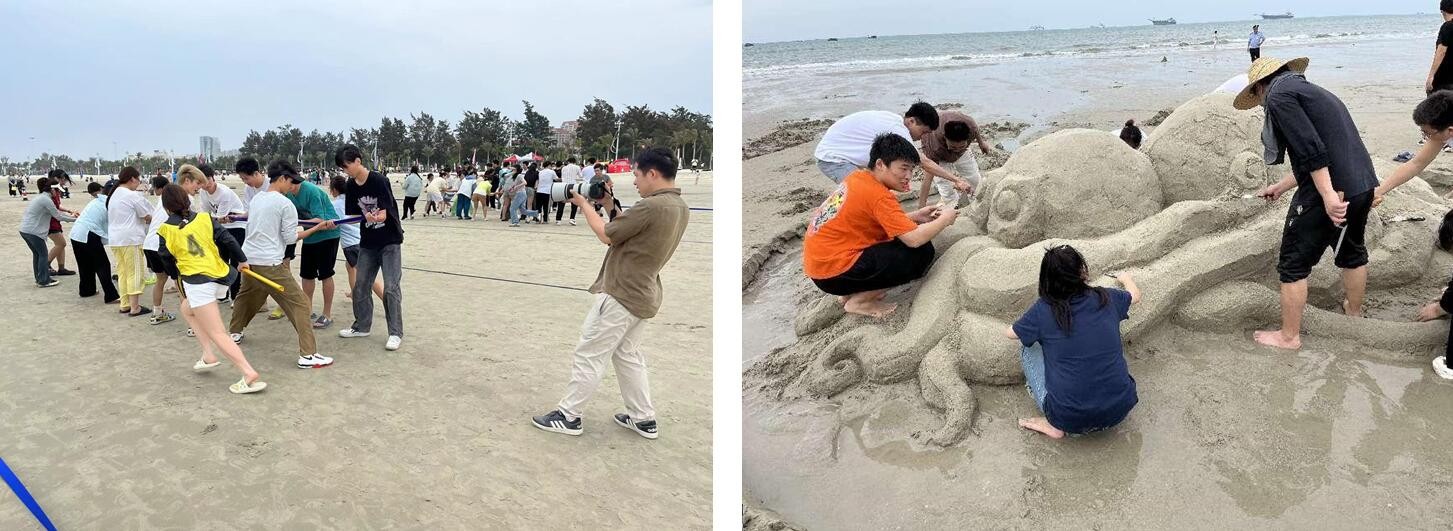 活动过程中,美院师生通力合作,在银滩风景区共同完成了一件又一件的精美沙雕作品,用不同的角度展现海洋文化,也在运动项目中共同鼓劲加油、挥洒汗水,进一步增强班级凝聚力。最终在沙滩雕塑中斩获一等奖一名、二等奖一名和优秀奖若干,也在沙滩排球项目中获得团体第二的好成绩。(李伟民,陈颖诗 摄)