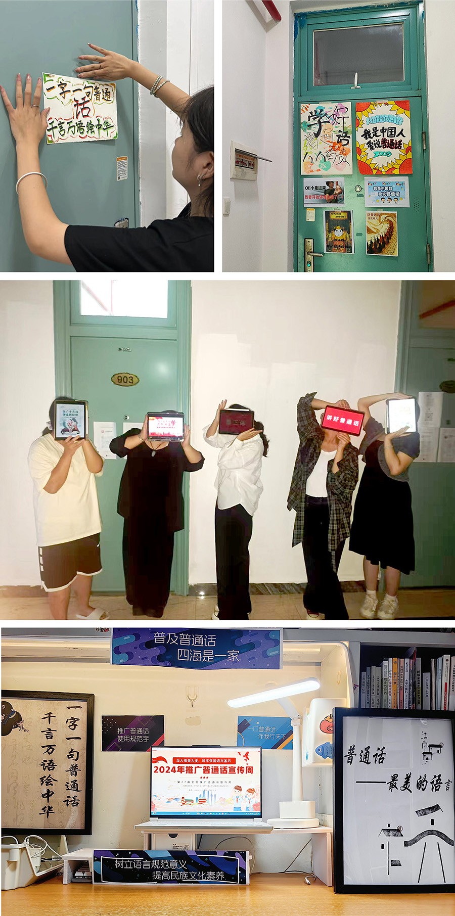在后续的系列活动中,在学生宿舍开展了以推普之家”为主题,鼓励同学们通过装饰、手绘方式进行推广普通话的宣传。