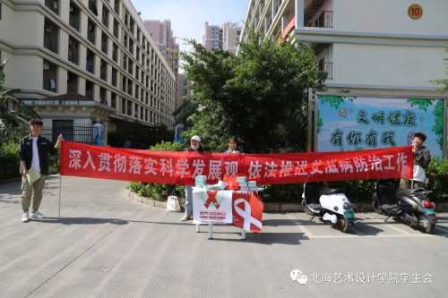 2020年12月1日,由北海艺术设计学院主办、校团委青年志愿者协会承办的世界艾滋病日防艾宣传主题活动正式拉开序幕。相关的摆摊宣传活动于东校区图书馆、东校区学生公寓二栋楼下、西校区食堂门口、西校区大礼堂门口、11栋女生宿舍楼下进行。艾滋病知识讲座于当日19:30在西校区大礼堂进行。