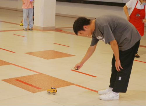在完成木质小车组装美化赛环节后,选手们由工作人员带领着来到了赛道。每位参赛选手满怀期待的派出他们的“战车”撞击前方的障碍物,将最上方的塑料杯推倒,并遥控小车通过终点,使小车车尾通过终点。比赛进行的十分激烈,现场气氛如火如荼。