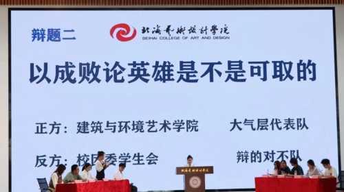 第二场辩题为“以成败论英雄是不是可取的”,双方辩手针锋相对,却又不失风度,侃侃而谈,妙语连珠,进行了激烈的对决。辩手们各显其能,巧妙应变,全力维护己方观点。