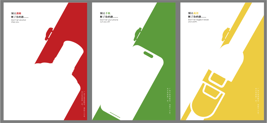 海报类:优秀奖  《交通安全系列作品-别让酒精、手机、不系安全带断了你的路》