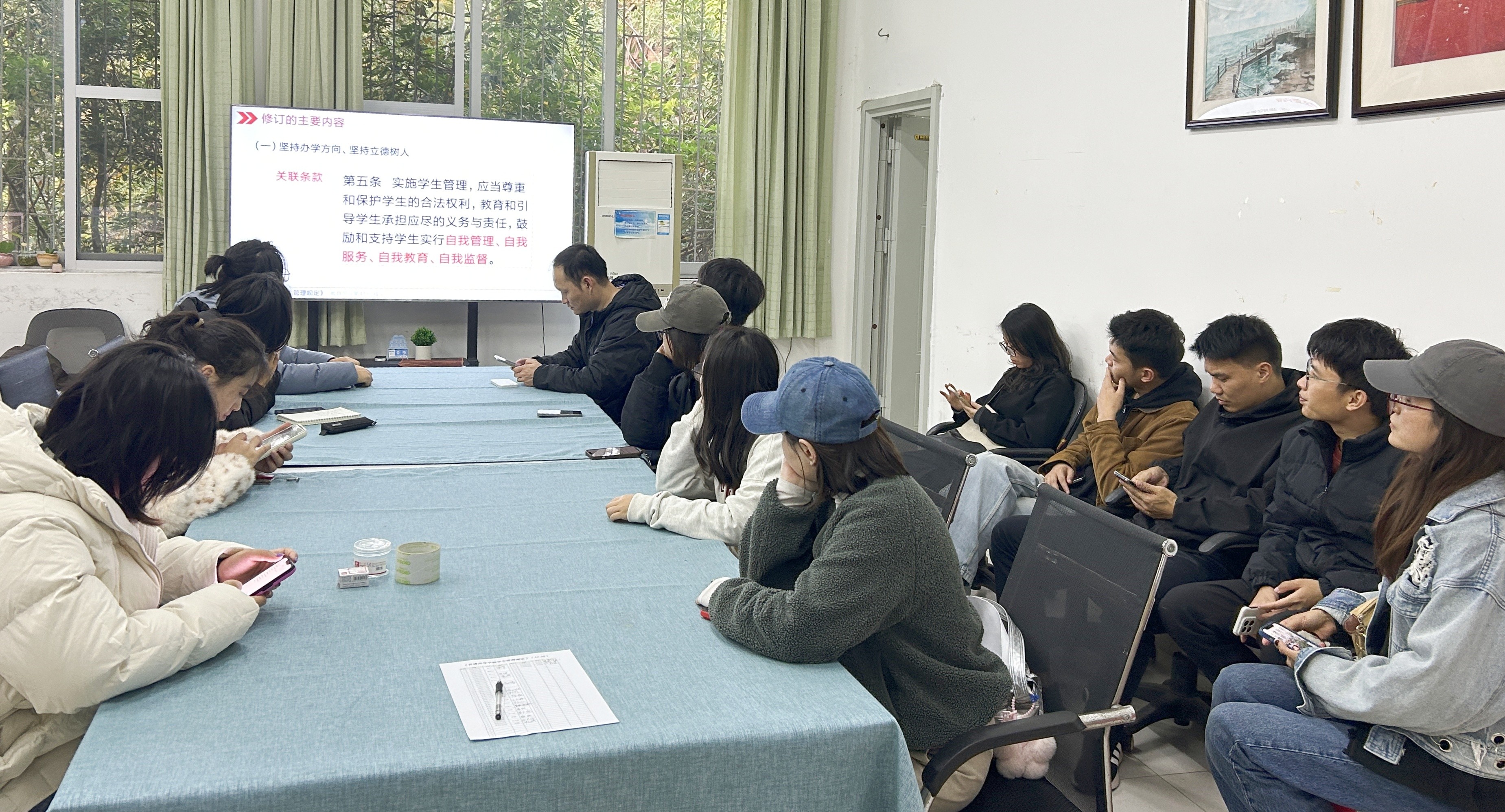 学院学工办精心准备释义与解读资料,助力辅导员深度领会文件精髓,确保在日常管理中精准施策、有章可循。各年级辅导员采用专题会议形式、分多个时间段精心组织学习,确保无一人遗漏,有效提升了辅导员对规定的知晓率与参与度。在学习过程中,辅导员们认真聆听、热烈讨论,就如何将规定更好地融入日常管理工作各抒己见,形成了良好的学习氛围。