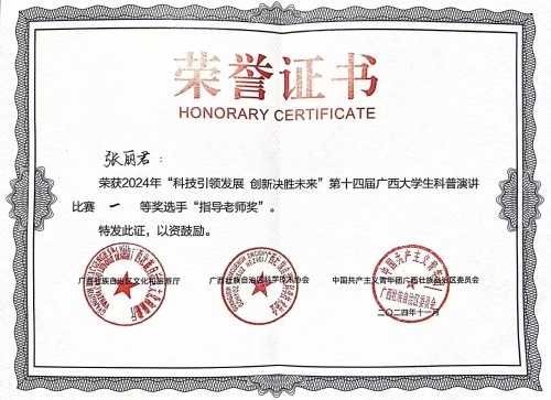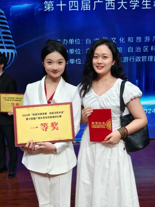 近日,第十四届广西大学生科普演讲比赛(决赛)在广西图书馆圆满落幕。我校师生在此次比赛中表现优异,其中我校教师张丽君荣获大赛指导老师奖,我校学子林怡蓉荣获决赛一等奖!