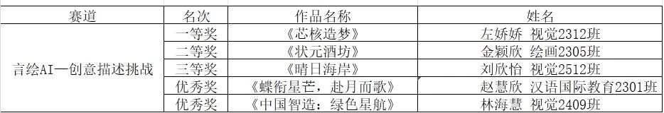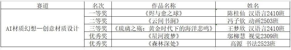 每一份参赛作品,都是学子们艺术素养与AI技术应用能力的集中体现;每一票的认可,都承载着对创新精神的推崇与鼓励。大赛秉承公平、公正的原则,现将最终评选出的各类奖项名单公示如下。