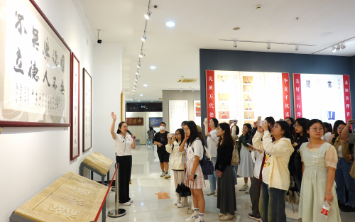 随后,博物馆的工作人员带领我院师生走进了一场历史悠久的文化盛宴。工作人员讲述崇德堂博物馆自创办以来便从全国各地征集道德文化匾额,迄今为止,匾额藏量已多达四百余块;接着又讲述了李馆长为了博物馆的发展而搜集千余幅当代书法名家道德书法作品以及200余方当代篆刻名家篆刻作品的经历;最后又带领学生欣赏了馆内500余张由夏商周至秦汉时期的蕴涵“德”子的拓片作品。这些优秀的作品都承载着“道德”文化,是我国优秀传统文化精神的缩影,为我院学生提供了近距离感知历史文化知识、领略中国民族文化魅力的极佳窗口。