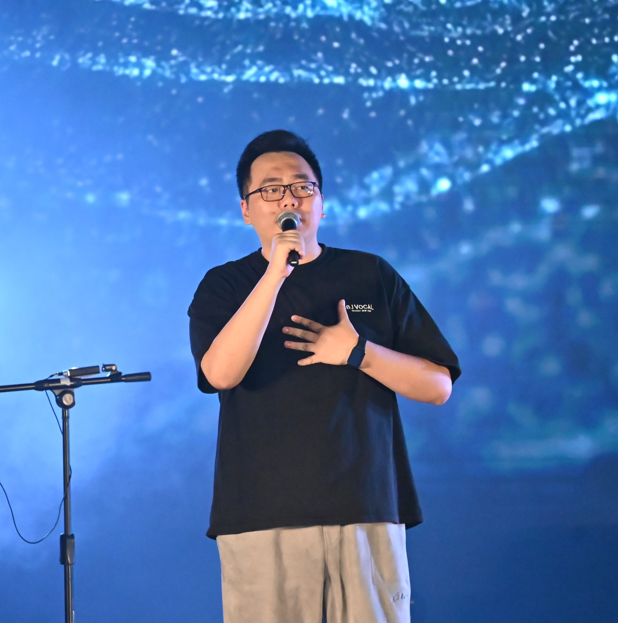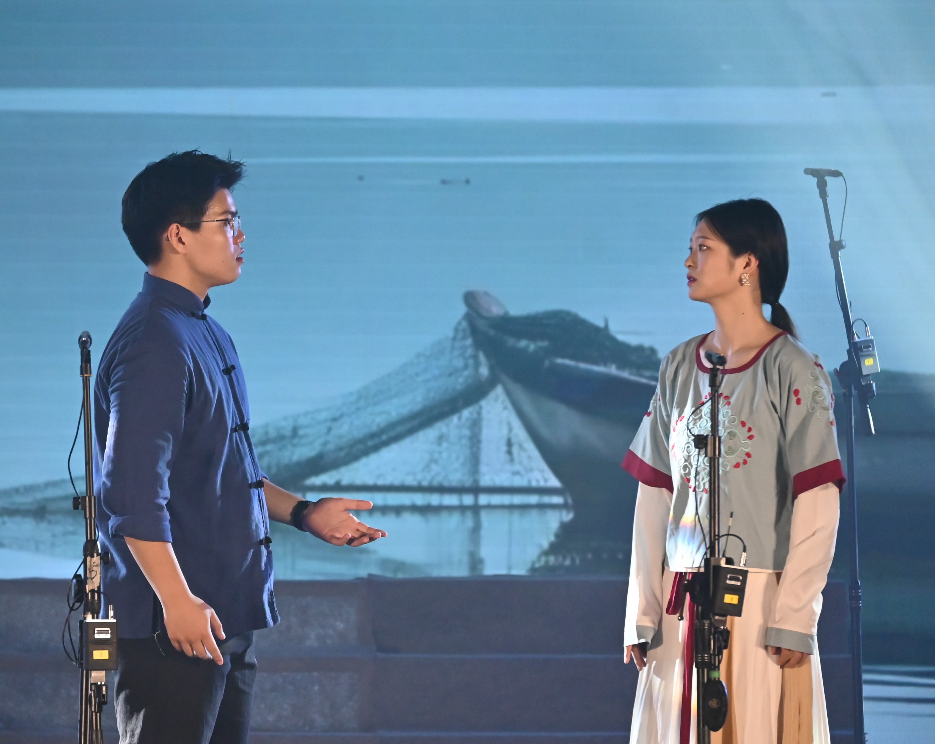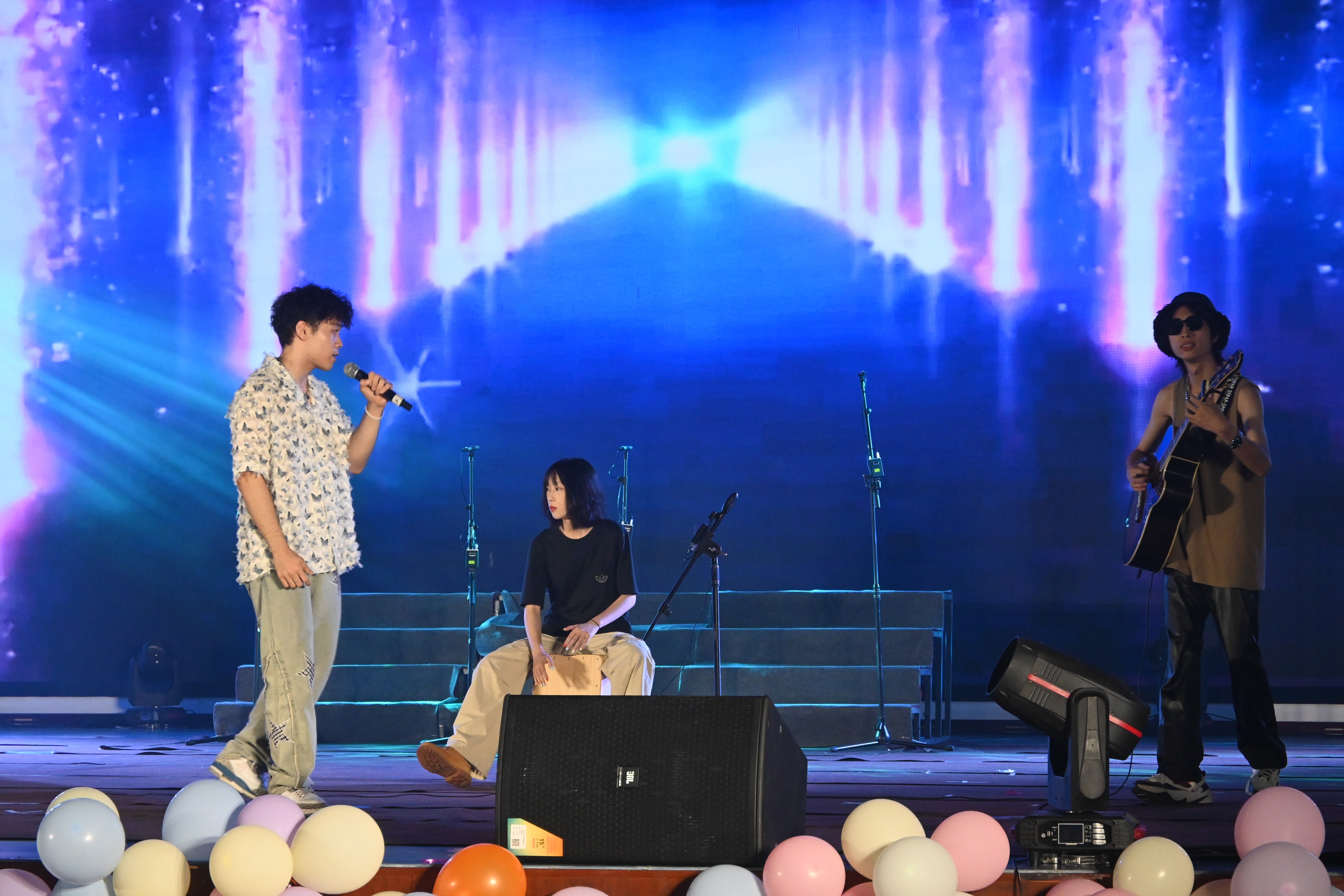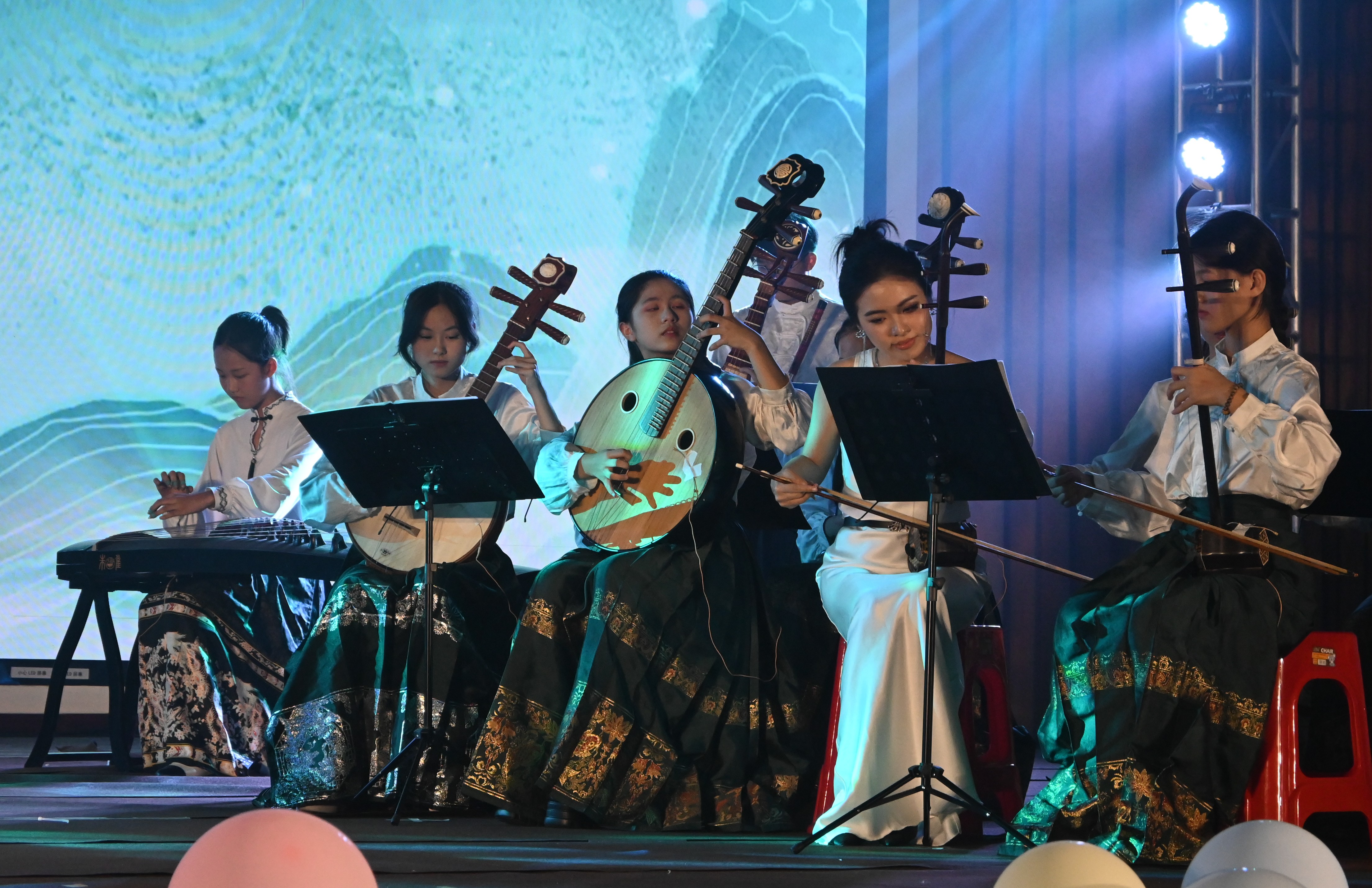 第一篇章:原创作品。一曲青春洋溢的《疍家美食颂》拉开了音乐会的序幕,王乐乐、梅紫怡、刘菁菁、徐悦、江琪五位同学将她们自己主持的国家级的大学生创新创业项目《疍歌笙生——以文创与原创音乐作品宣传疍家文化》的阶段成果搬上了舞台, AI技术与人文艺术的和谐交汇赋予了传统文化新的生命力,诠释了北海本土疍家文化的独特魅力和价值。