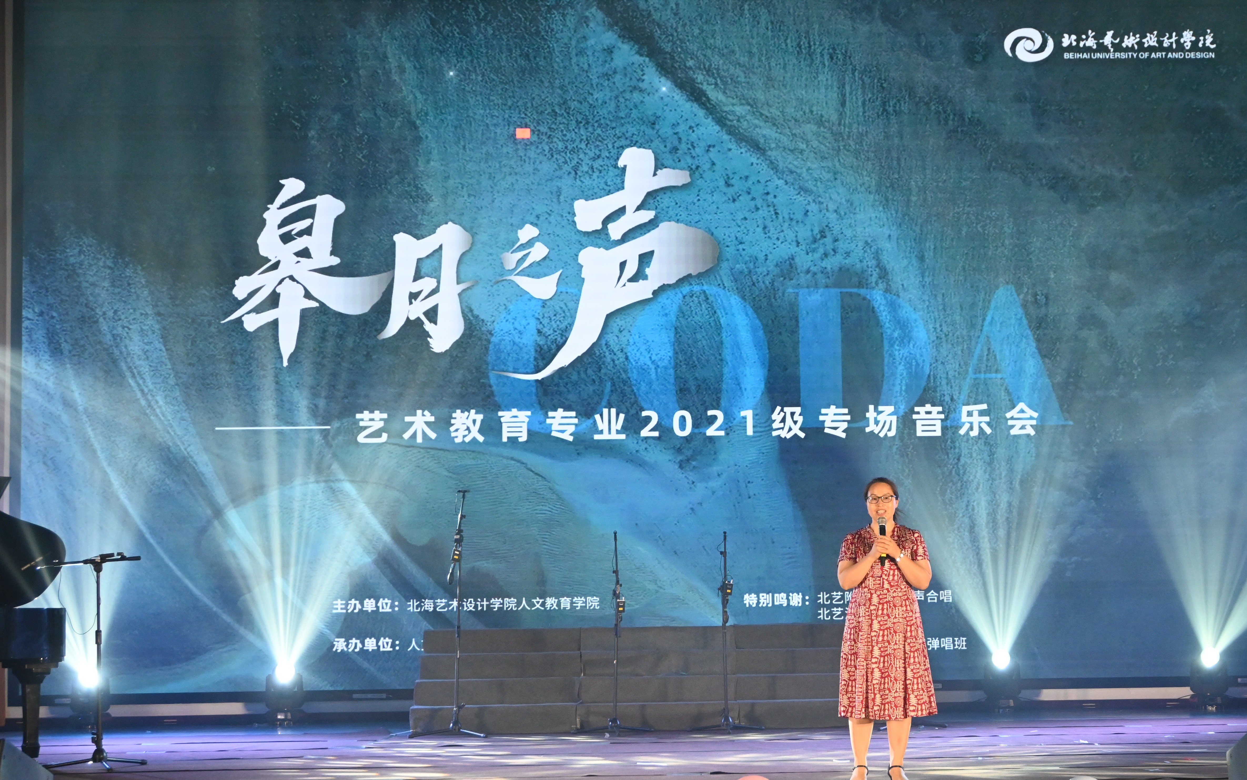 以歌声展梦之翅,乘皋月之风翱翔。6月4日晚,人文教育学院在西校区大礼堂举办了“皋月之声——艺术教育2021级专场音乐会”,北海艺术设计学院附属学校校长包玉红、副校长陈春华,北海艺术设计学院党委副书记刘承初,人文教育学院院长熊秀峰、副院长李谦,艺术教育教研室主任孙嘉昕,北海艺术设计学院附属学校艺乐童声合唱团的成员、指导老师,以及艺术教育专业全体师生,欢聚一堂共同观赏了音乐会。