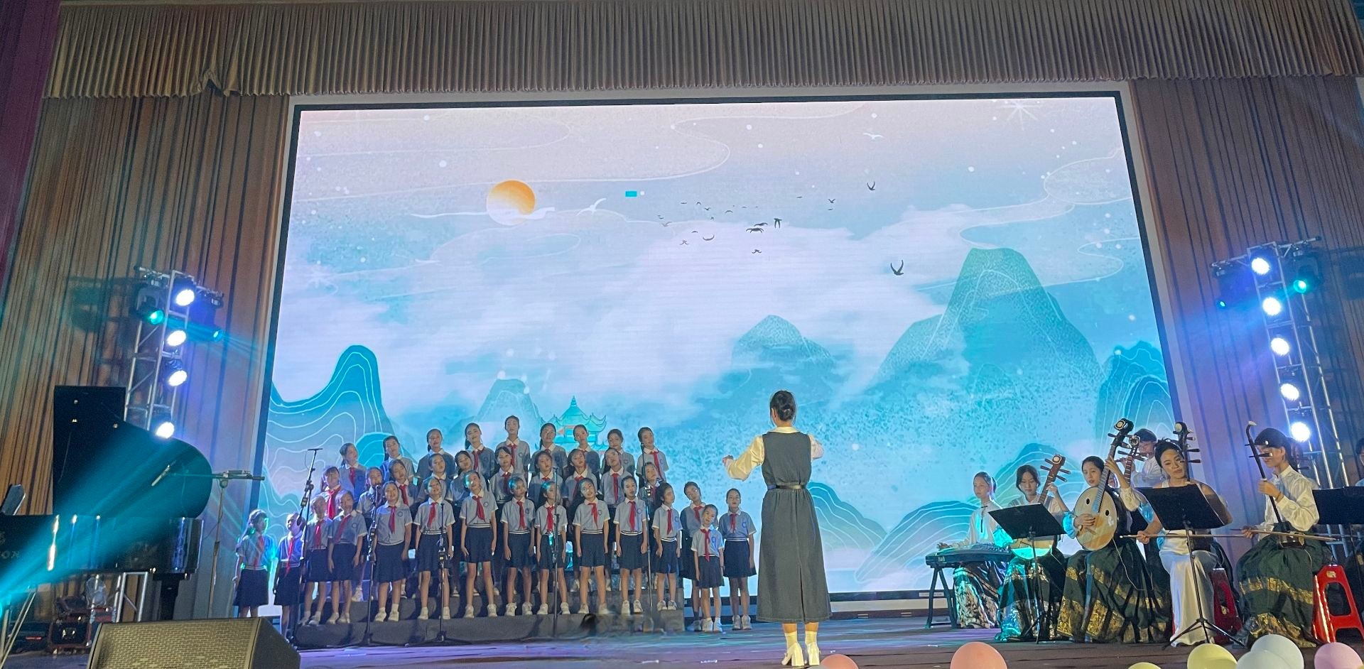 第四篇章:合唱与指挥。合唱指挥课程是艺术教育三年级专业必修课,通过结合在北艺附小的教育见习环节,让学生在实践中加深了对大型音乐作品的综合理解和技能的掌握。当晚与北艺附校艺乐童声合唱团联合出演三首作品《萱草花》、《悬崖上的波妞》《上春山》,既有童趣的展现,也有将合唱与民族音乐元素和古诗词的意境融合的民族弦乐合奏创新之作,切实地把学习成果转化为生动实践。