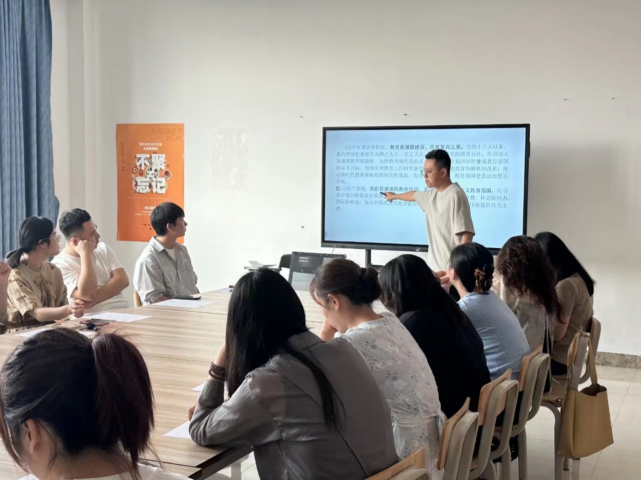 曹永攀强调,学院教职工在集中学习过后应认真学习领会文件精神,深入贯彻落实,务实功,出实招,求实效,奋力谱写教育强国建设新篇章。并提出具体要求:一要提高政治站位,切实把思想和行动统一到全国教育大会精神上来;二要强化使命担当,坚决贯彻落实党中央关于建设教育强国的重大决策部署;三要加强组织实施,确保全国教育大会精神落地见效。全体教职工鼓掌表示赞同,会议圆满结束。(吴柔洁/摄)