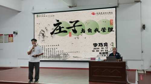 为培养我院学生的学术素养,提高学生的知识水平和认知能力,增强学生的自我管理能力,10月17日晚,我院邀请教授李乃龙于伦理楼107教室为广大师生带来一场题为《庄子与自我管理》的精彩讲座,文学院2022级、2023级学生参加讲座。本次讲座由我院汉语言文学教研室副主任康宗明主持。