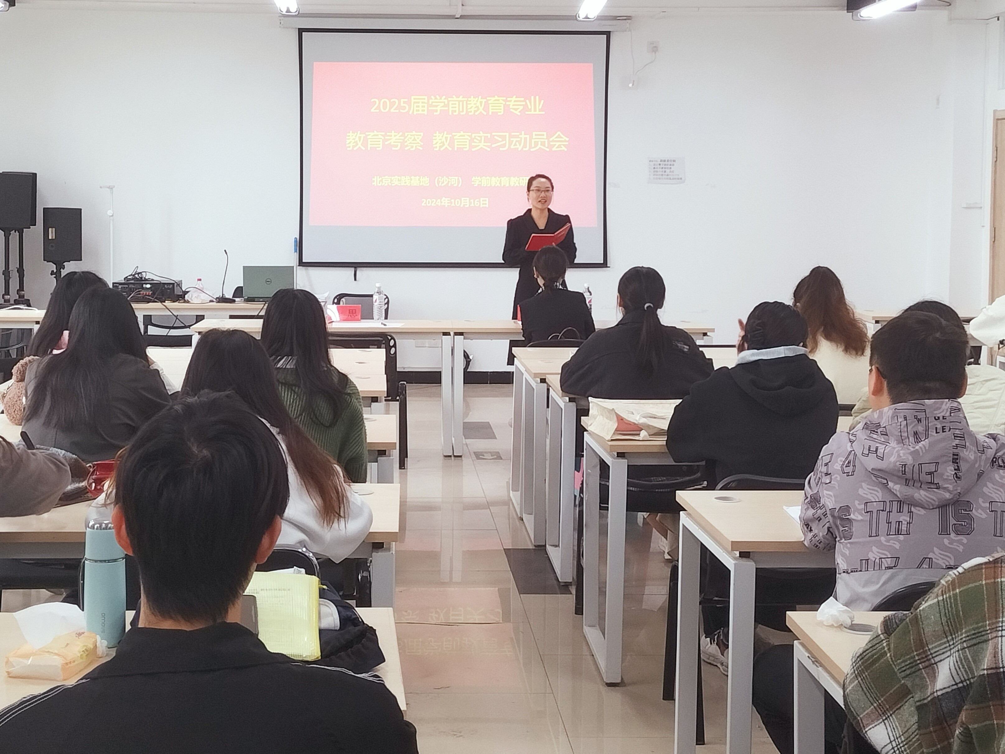 顺利推进2025届毕业生考察、实习工作,帮助学生明确考察、实习的目的、任务和重点,加强毕业生考察、实习期间的安全管理,确保相关工作有序开展。2024年10月16日上午,教育学院于北京实践基地205、207教室召开2025届毕业生教育考察、实习工作动员大会。教育学院副院长蒙剑英,学前教育教研室主任覃思,艺术教育教研室副主任周劲志出席会议,2021级艺术教育专业、学前教育专业全体学生参会。