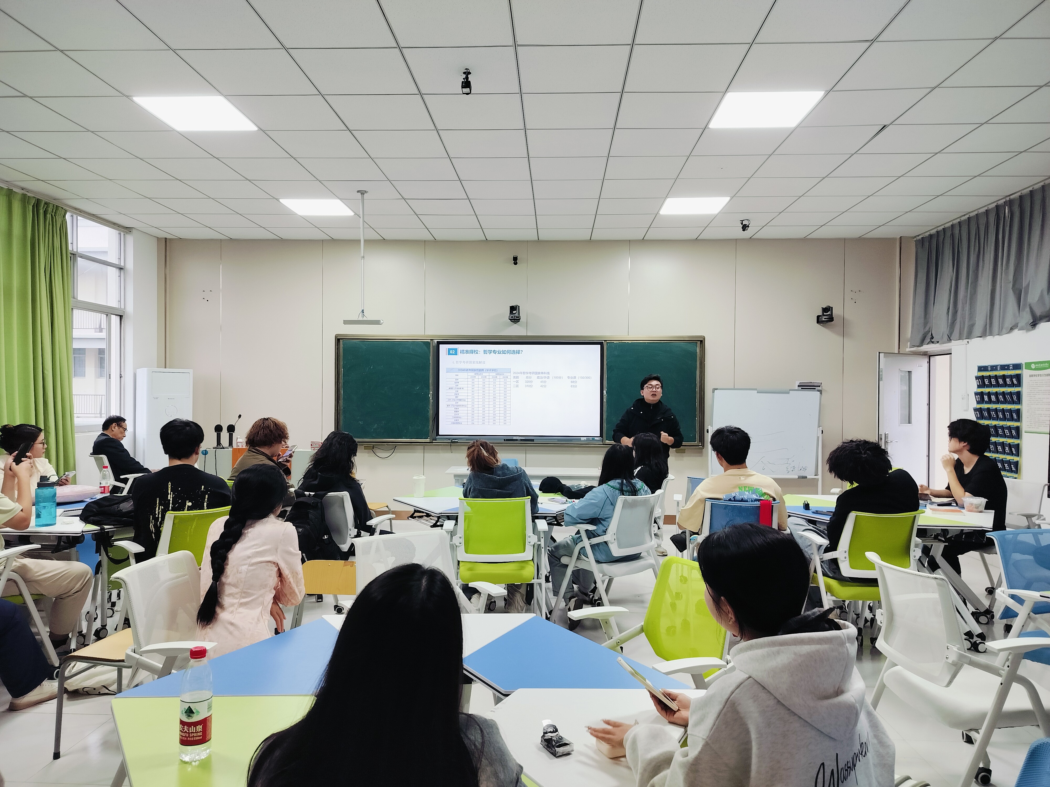 随后,夏兴志老师以“研究生是什么?”这一问题为切入点,从我国学历层次和学位类型的角度,为同学们详细介绍了研究生的基本概念与内涵。接着,他从学历提升与职业发展赋能两个关键维度,深入剖析了考研的重要价值,让同学们对考研的意义有了更为清晰、深刻的认识。在备考指导环节,夏老师围绕精准择校、专业选择、招生信息获取、考研真题研读以及科学备考策略等核心内容,进行了全面且细致的讲解。他不仅分享了实用的备考技巧和方法,还针对同学们提出的各类疑问进行了耐心解答,帮助大家消除备考过程中的困惑,进一步深化对考研全流程的认知。