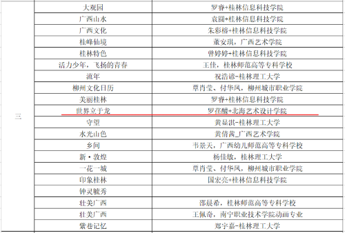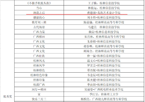 近日,由广西壮族自治区文化和旅游厅、自治区教育厅、自治区科学技术厅、自治区农业农村厅、自治区商务厅、自治区国资委主办,广西广文创意数字科技有限公司承办的“漫绘广西,秀展八桂” 2022广西金桂国漫大赛公示了获奖名单。我校动画与传媒学院共获奖11项,其中场景类二等奖3项、三等奖1项、优秀奖1项;动漫角色设计类二等奖1项、三等奖1项;广西特色文化类三等奖1项、优秀奖3项;孙永辉、 虞德强、李宗毅、吴锡红等老师荣获优秀指导教师奖;动画与传媒学院获优秀组织奖。