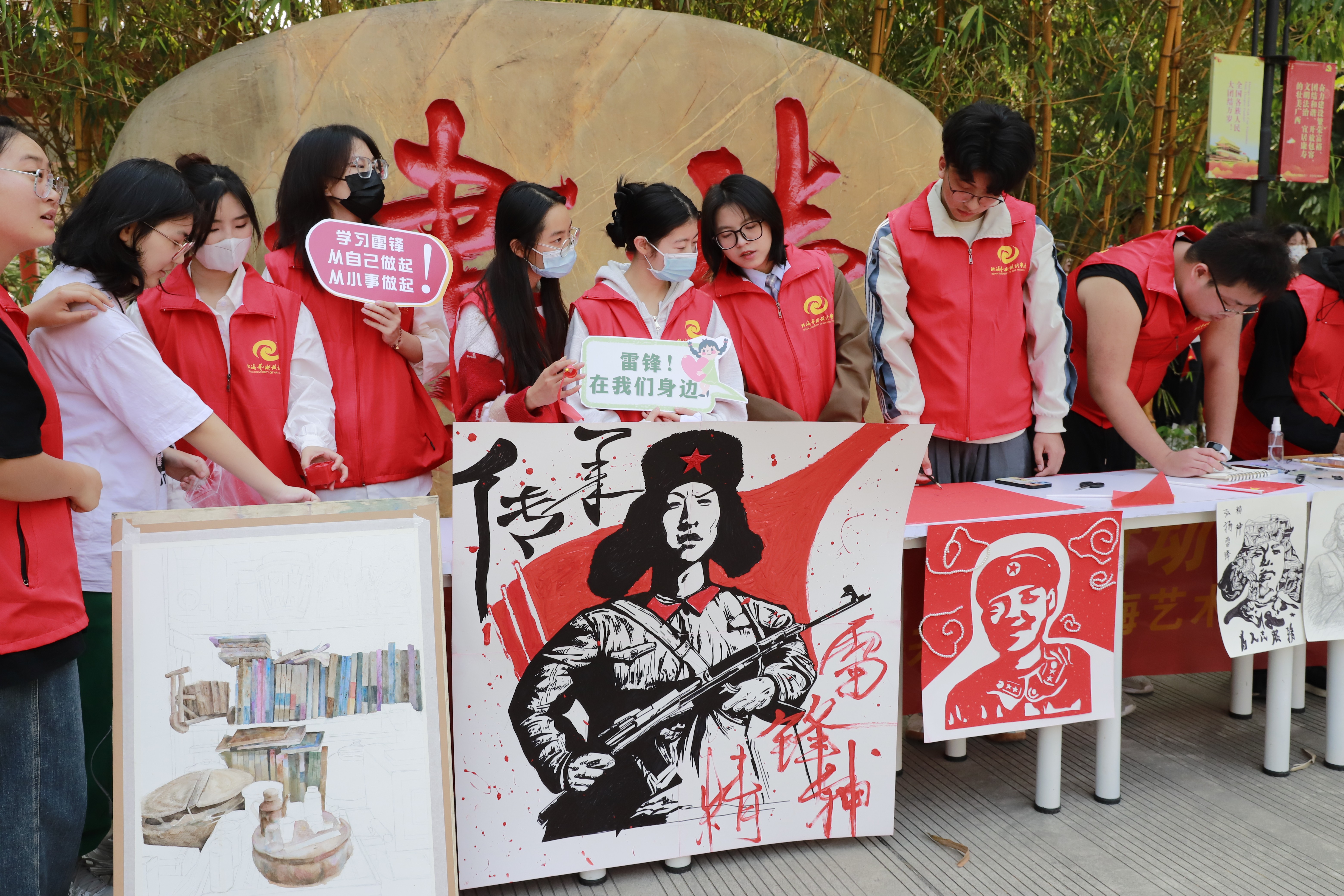 学校通过弘扬学习雷锋精神、践行雷锋精神,融合课程思政及学生实践弘扬时代新风,结合专业特色发挥专业优势,书写雷锋精神、绘制雕塑雷锋像、演绎雷锋故事、诵读雷锋日志、设计雷锋精神相关文创与影视动画作品等形式让雷锋精神全面系统融入日常课程之中,不断引导广大师生见贤思齐,矢志不渝传承雷锋精神。在直播活动中,“歌舞快闪”“爱心义卖”“‘雷锋精神’学习作品创作展示”等活动开展得如火如荼。师生集体齐唱歌舞节目《学习雷锋好榜样》,歌声铿锵、舞姿优美,现场互动热烈,在欢快气氛中深刻领悟雷锋精神内核;学生纷纷拿出手工制品进行校园爱心义卖,并将义卖所得捐赠到特殊学校进行爱心捐助,以实际行动传播爱心能量;学生通过现场书写、制作、绘制弘扬雷锋精神作品展示,诵读雷锋日志、讲述雷锋故事,传扬雷锋事迹,树立时代信念,让雷锋精神深入人心,滋养心灵。