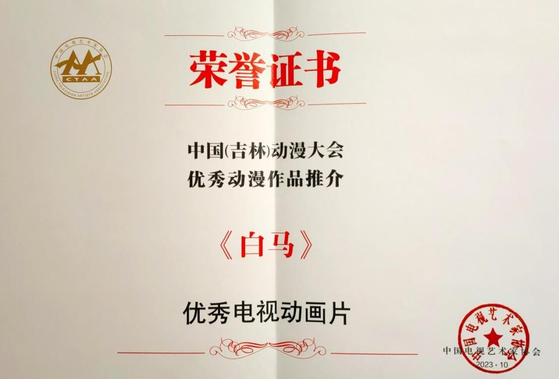 动画与传媒学院动画作品《白马》优秀动漫作品推介证书