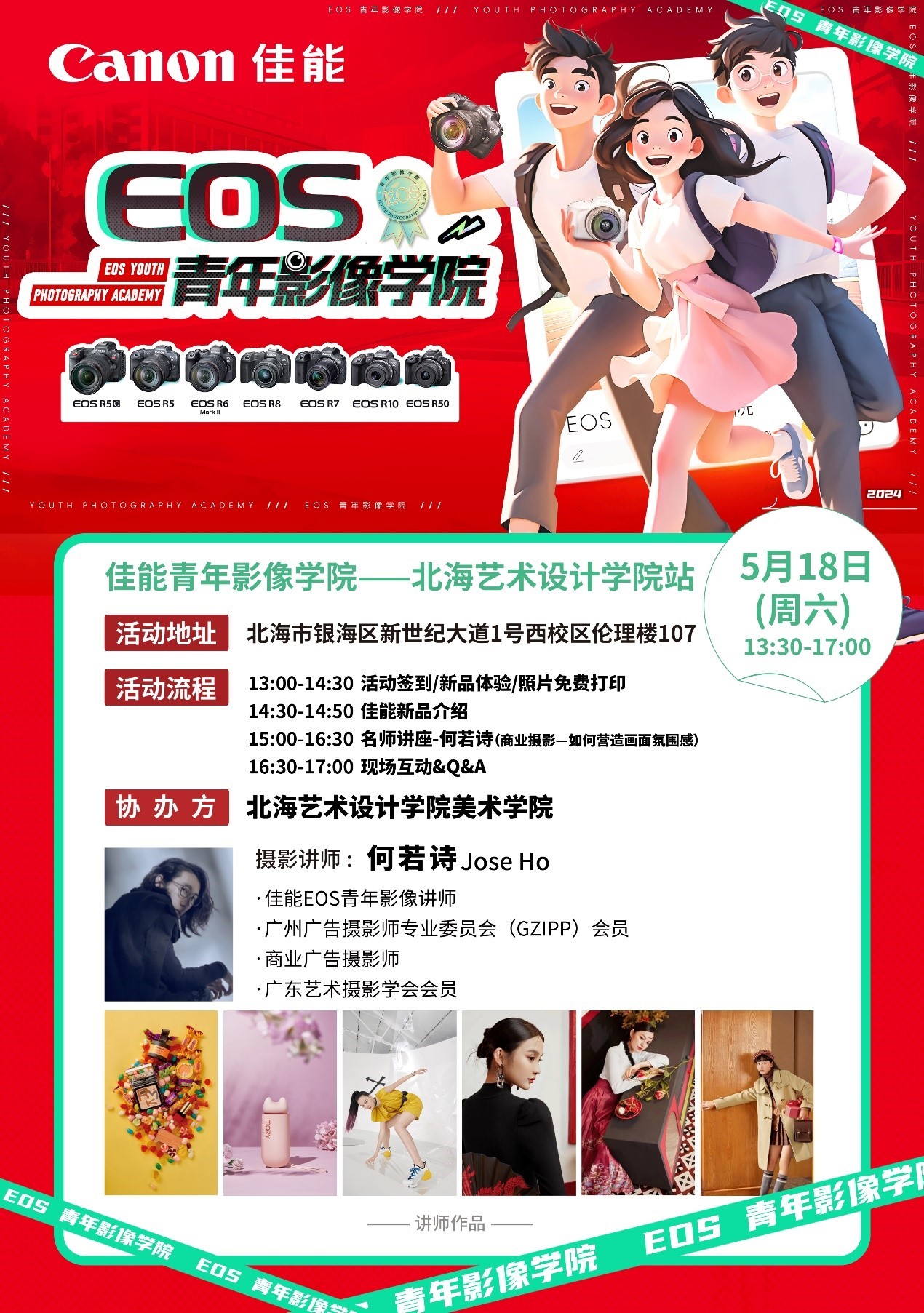 除了互动体验外,本次活动还开设了产品介绍、名师讲座等活动内容,并由佳能EOS青年影像讲师、广州广告摄影师专业委员会(GZIPP)会员、广东艺术摄影学会会员、商业广告摄影师何若诗作为本次活动的摄影讲师。旨在为师生们提供与工作在一线的商业摄影师互动交流的机会,从而深入了解商业影像创作的流程,并对商业摄影创作规范与技巧有进一步的认识。