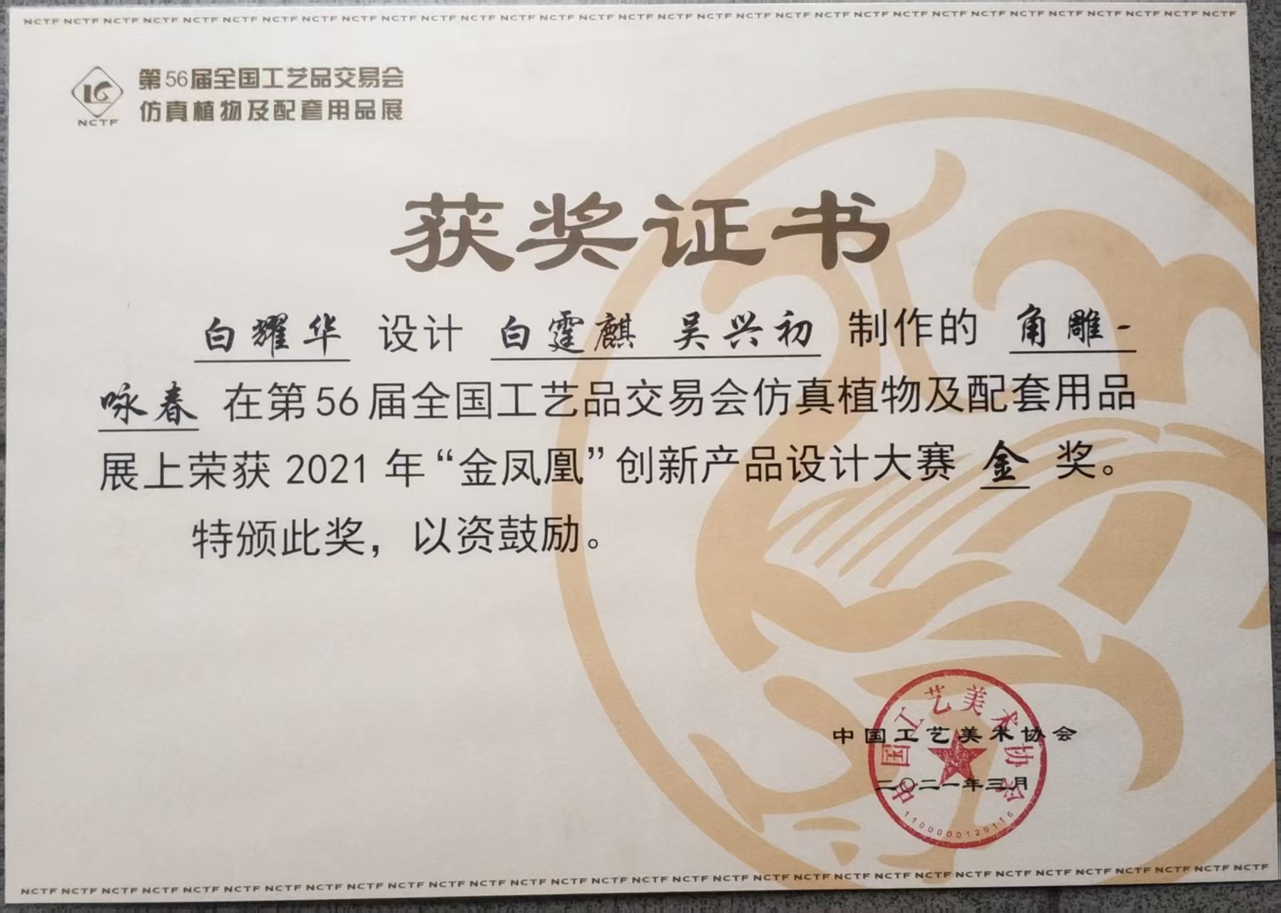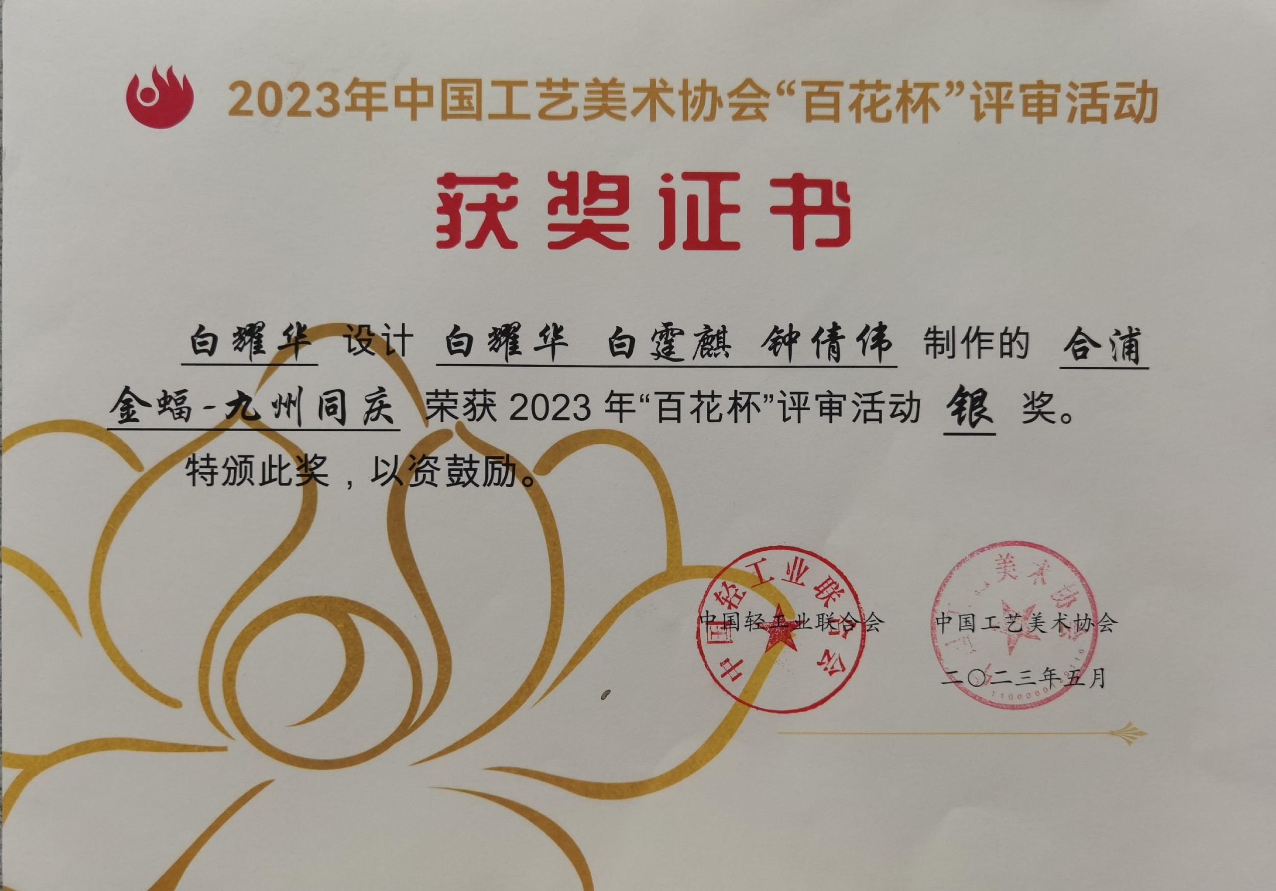 在实践指导方面,白耀华教授带领学生深入角雕创作一线,从选料、设计到雕刻,每一个环节都耐心指导,帮助学生掌握角雕技艺的精髓。他还积极参与指导青年教师,分享自己多年的创作经验与艺术理念,提升教师的教学与实践能力,助力学校打造高水平的师资队伍。在他的指导下,许多学生在各类艺术活动与比赛中崭露头角,为学校争得了荣誉,也为合浦角雕技艺的传承培养了新生力量。同时,通过与学校的合作,合浦角雕这一非遗文化在校园内得到广泛传播,丰富了校园文化内涵,促进了传统文化与现代教育的融合。此外,白耀华还获得了众多荣誉称号。201869日,他被评为“中国工艺美术大师”;20201229日,荣获“广西工匠”称号;20218月,荣获广西五一劳动奖章。2021年,他设计、白霆麒和吴兴初制作的角雕《咏春》在第56届全国工艺品交易会仿真植物及配套用品展上荣获“金凤凰”创新产品设计大赛金奖;20235月,他设计的合浦金蝠《九州同庆》荣获2023年“百花杯”评审活动银奖;20245月,作品《祥和九州》在第四届“百鹤杯”工艺美术设计创新大赛中荣获百鹤新锐奖。