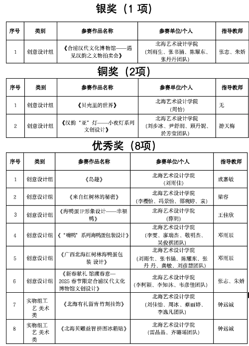 近日,由北海市旅游文体局主办、北海市非物质文化遗产保护中心和市旅游协会承办的2024年“北海有礼”特色旅游商品大赛已经圆满结束。此次大赛共收到参赛作品265套609件,分别评选出金奖1名、银奖9名、铜奖14名、优秀奖29名、优秀组织奖6名。我校设计艺术学院在此次比赛中表现突出,师生们凭借出色的创意和扎实的设计功底,荣获银奖1项、铜奖1项、优秀奖8项。同时,我校因出色的组织工作荣获优秀组织奖1项。