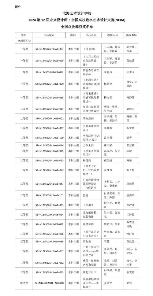 同时,在2024未来设计师·全国艺术设计教师教学创新大赛(NDTC)中,设计艺术学院教师吴慧霞团队课程案例《北海文化旅游品牌形象设计》荣获“案例”赛道全国一等奖;白建强团队课程《文创产品设计》荣获“课程”赛道广西赛区二等奖;梁容老师作品《广西八桂城市市花主题邮票设计》和蓝冬洁老师作品《乡村故事》分别荣获“作品”赛道广西赛区二等奖。
