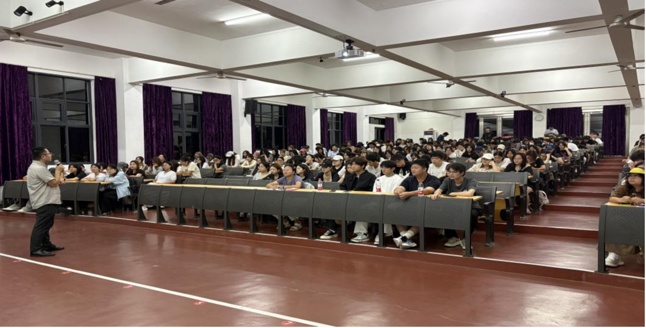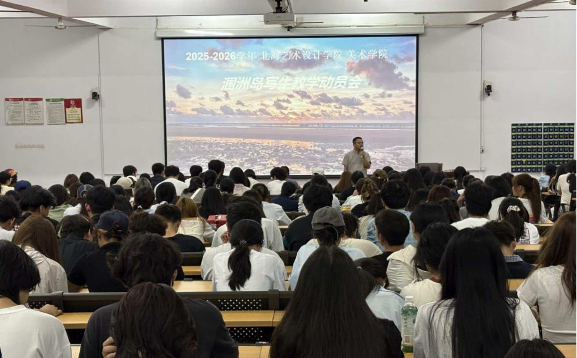 动员会讲解了涠洲岛写生事宜,包括行程安排、岛屿概况、安全规范及教学任务等内容。龚院长着重强调了安全规范及教学任务两方面。学生应爱护岛上动植物,禁止如下海游泳、私自捕捞海产等危险行为,在住宿点和景点注意文明礼貌;在完成色彩风景写生、速写及实习报告等学习任务的同时,鼓励学生参加手机摄影大赛,丰富学习体验,提升综合素质。最后赏析了一些展现涠洲岛风光的名家画作及往年优秀学生作品,至此,动员会圆满结束。(林昌华 马圣翔 摄)