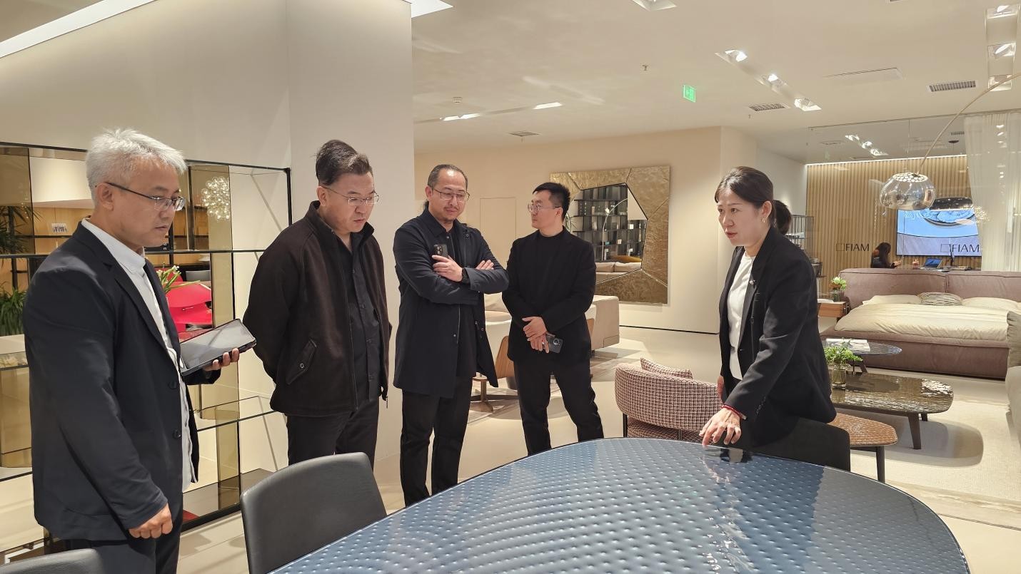 走访团队首站走进北四环居然之家,深入CASSINA、vispring、FIAM、POLTRONAFRAU等意大利高端家居品牌门店。邱杰副校长详细询问产品设计逻辑、材料应用趋势及当下人才需求,强调高校需以行业前沿为导向,将企业实践经验与设计标准融入教学,提升学生解决实际问题的能力。