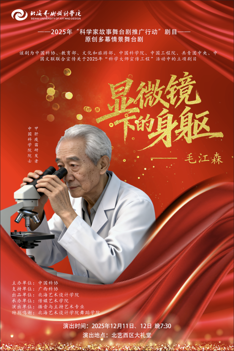 当舞台光影掠过岁月长河,当青春演绎触碰科学星辰,2025年“科学家故事舞台剧推广行动”携光而来——传媒艺术学院播音与主持艺术专业原创多幕情景剧《显微镜下的身躯——毛江森院士》成功入选国家级立项名录并获经费支持,以艺术之名向科学精神致敬。