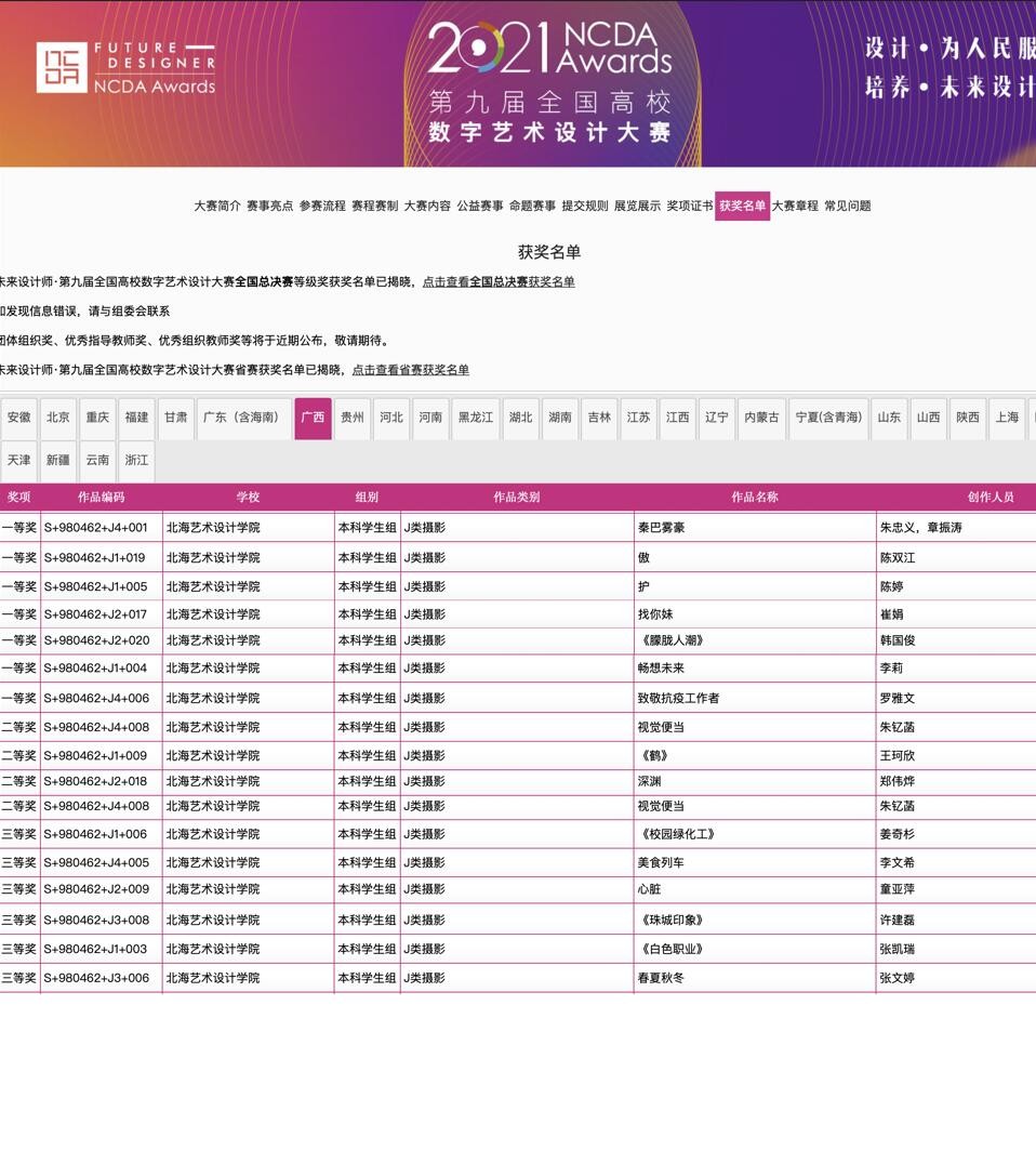 美术学院摄影系与绘画系学生荣获第九届全国高校数字艺术设计大赛(未来设计师NCDA大赛)全国总决赛二等奖1个,三等奖1个。华南赛区一等奖7个,二等奖4个,三等奖6个。除学生组外,林昌华老师《理想生活之梦里、梦外》作品荣获华南赛区教师组二等奖,唐海副教授《丫人甲的MIUI生活》作品荣获华南赛区教师组三等奖。唐海荣获《优秀组织教师》、《优秀指导教师》称号,李炫勋、郭刚、鲁明阳、孔令石、陈越荣获《优秀指导教师》称号,我校荣获广西赛区《优秀组织奖》。