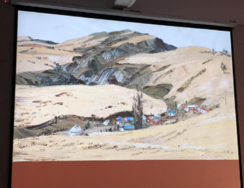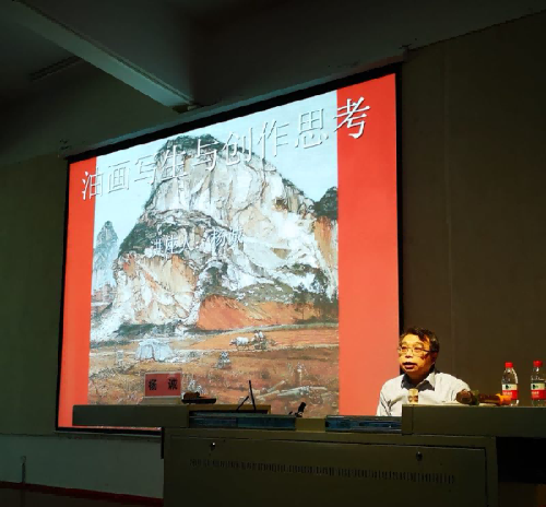其次,杨诚教授讲述油画风景写生有两点很重要,一是要树立自己的艺术思想观念,二是要注意油画写生的要求。并列举自己的一些作品给大家做了详细的分析,讲述在对于山水写生的时候,要注意山与山之间的联系,要描绘出山的厚重与原始的状态,加强感觉,构图饱满,由远及近,从前往后依次进行;对于民居写生时要注重生活的状态和物品的历史感;写生田园风光时,一般绿色最难描绘,但我们应该是先找出最绿色,然后分清冷暖进行绘画,着重强调了色彩关系的运用。