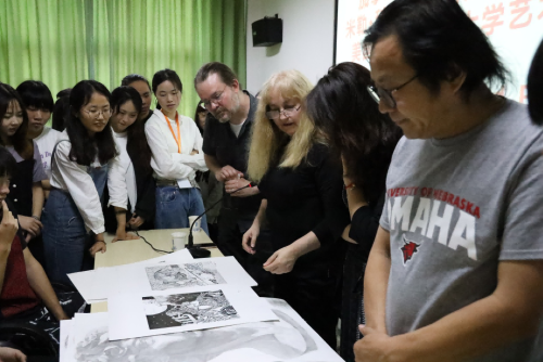 最后,学生们拿出平时最优秀的作品请艺术家与教授观看及指导。艺术家们对每位同学的作品都细心指导点评。针对学生作品中的不足予以指出,对于优秀的地方则鼓励其继续进行的提升。