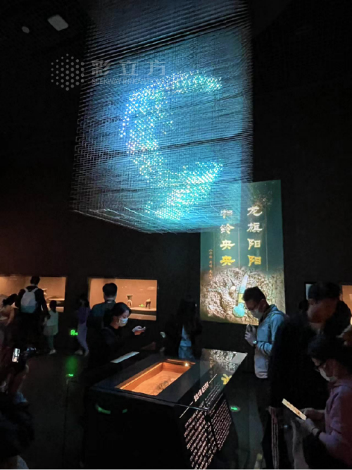 为了更鲜活地展示这件宝物,彩立方提供了拥有发明专利三维灯光艺术装置,运用裸眼真3D的艺术灯光将“龙图腾”生动演绎,映衬着绿松石龙形器,彼此相得益彰,让文物“活”起来,助力中国考古博物馆镇馆之宝的精彩亮相!