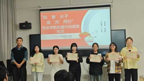 本次“知‘食’分子,追‘光’而行”光盘行动的颁奖仪式于12月4日在南校区艺德楼507书法教研室进行。由书法学院常务副院长苏乃从、党支部书记喻广林、学工办主任兼分团委书记李家琪、实验室主任宁梦宇等领导教师为获奖同学颁奖。