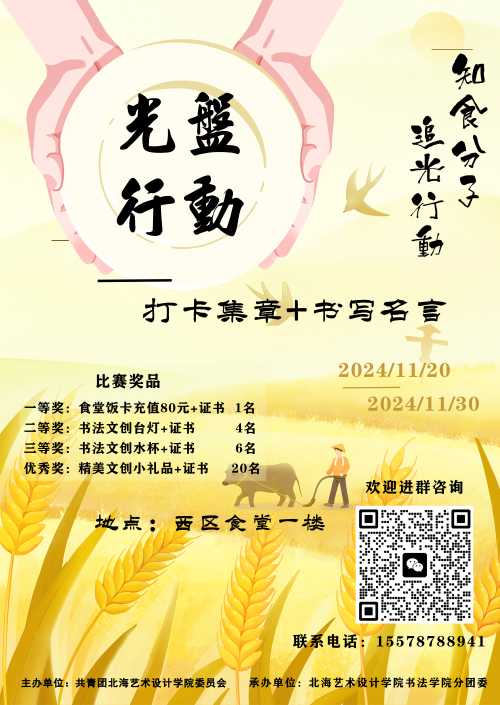 作品要求:现场书写活动。书写内容要求是一些有关珍惜粮食的名言诗句或者光盘后的心得感悟。所临摹创作书写的作品,加上书法集章打卡活动,按比重得分,(书法集章打卡比重占80%,现场书写比重占20%)最终由评审老师评选出等级奖并颁发奖品和证书。