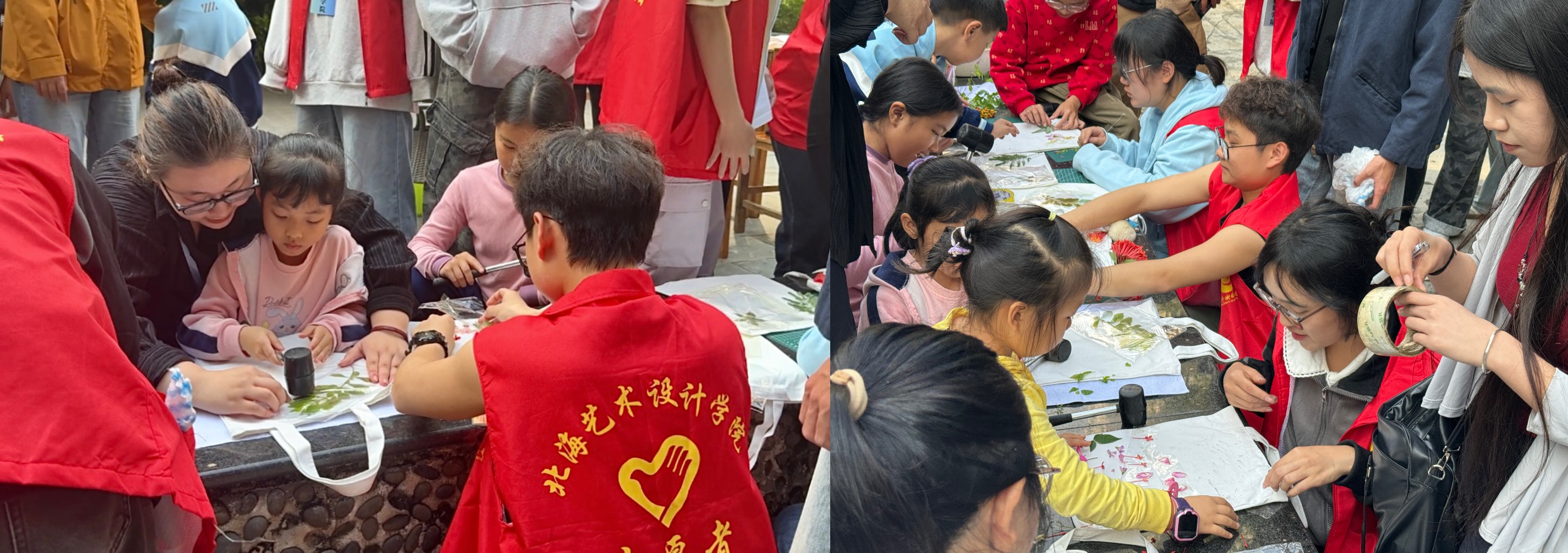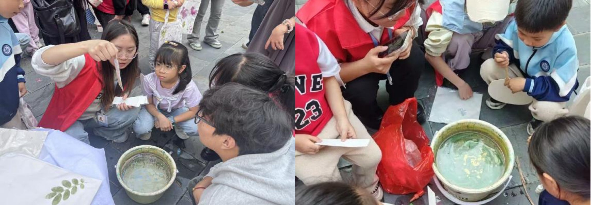 活动现场一共设置植物拓染、漆扇创作两大手工体验区,以及一个社区志愿服务组,志愿者们分工明确、热情投入。