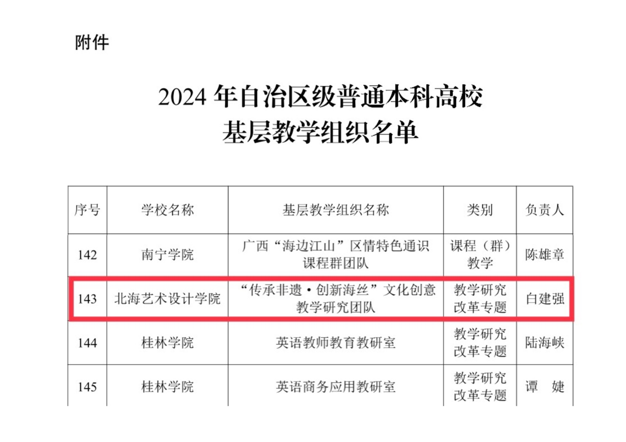 近日,自治区教育厅正式发布了《2024年自治区级普通本科高校基层教学组织名单的通知》(桂教办〔2024〕941号)。设计艺术学院《“传承非遗·创新海丝”文化创意教学研究团队》入选,标志着我院在非遗与海丝文化传承创新领域的教学研究与改革实践取得了一定成效。