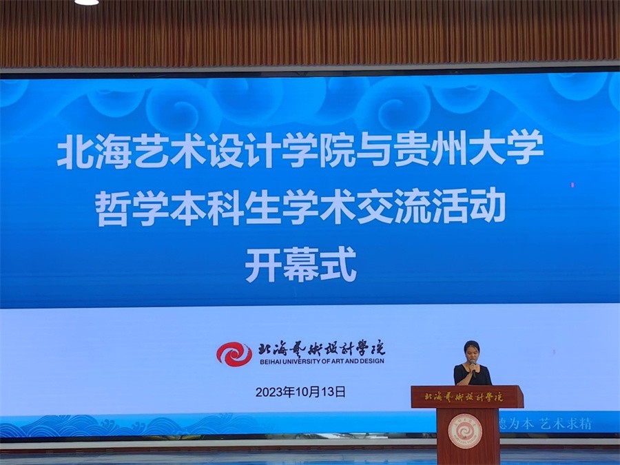 贵州大学哲学学院宋君修副教授结合北海艺术设计学院的校史和校园文化,对我校“道德为本、艺术求精”的办学理念给予肯定,指出我校的碑刻文化蕴含着丰富的哲学思想,并期待两校的交流活动精彩、成功。