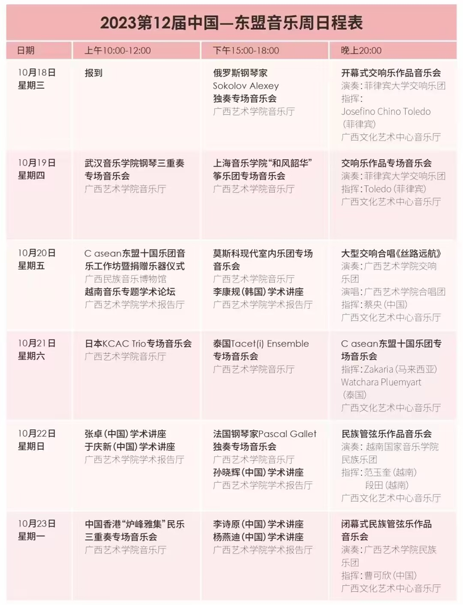 东盟音乐周是由广西艺术学院主办的大型国际性音乐活动。每年都有来自东盟十国及亚、欧、大洋洲各国音乐家、表演团体等到南宁进行音乐表演与交流。音乐周主要包含音乐会(交响乐音乐会、钢琴专场音乐会、管弦乐作品音乐会、室内乐团专场音乐会以及各国的专场音乐会等)、大师学术讲座等。