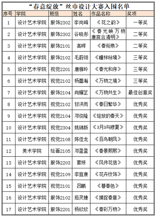 为提升专业人才培养质量,丰富学生校园专业实践活动,设计艺术学院举办了第一届“春意绽放”丝巾设计大赛并于6月7日在南校区举行颁奖仪式。