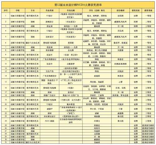 在第12届未来设计师NCDA大赛中,动画与传媒学院作品《悦膳房-陪在您身边的膳食专家》斩获国赛一等奖,作品《生如夏花》荣获国赛二等奖,作品《异闻志——九界》荣获国赛三等奖,作品《爱国歌》《非遗·香云纱》等21件作品荣获广西壮族自治区省赛奖项。动画与传媒学院陈蔓延、冯兆丹、刘嘉霖、吴佳燕、许一桐、虞德强、张丽君7位老师获评为优秀指导教师。