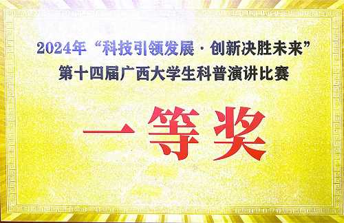 近日,第十四届广西大学生科普演讲比赛(决赛)在广西图书馆圆满落幕。我校师生在此次比赛中表现优异,学生林怡蓉荣获决赛一等奖,教师张丽君获大赛指导老师奖。