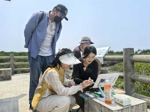 山口红树林保护区作为南方沿海面积最大的红树林生态系统,拥有8000公顷的“海洋绿肺”。退潮后的滩涂上,盘根错节的“呼吸根”构成天然迷宫,招潮蟹列队“巡防”,弹涂鱼泥潭“起舞”,白鹭掠过波光粼粼的水面,构成生动的生态教育场。动画与传媒学院师生深入保护区核心区域,实地观察红海榄、木榄多种珍稀红树植物构成的生态奇观。