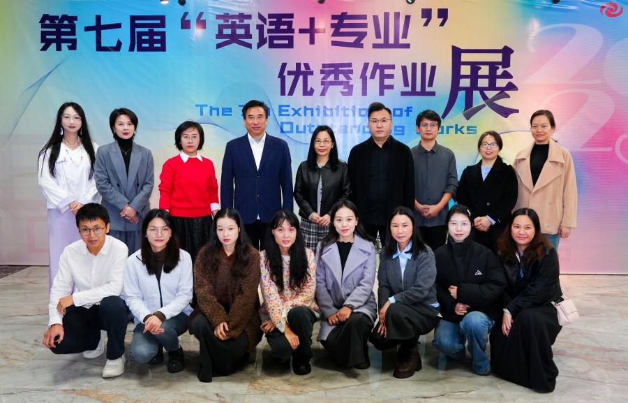 此次展览共展出2024级学生的220幅优秀作业,涵盖8个主题,包括中国传统文化、爱国主义、中国智造、年轻一代、体育、大学校园、广西非物质文化遗产和魅力北海。在作业中,学生将本土文化、社会议题或专业领域的独特视角融入英语表达,例如用英语阐释中国传统文化符号、当代社会发展或科技创新成果,使英语不再局限于西方语境,而是成为承载全球多元文化的载体。这种“文化翻译”过程丰富了英语的表达内涵,使其更具包容性与时代感。现场合影