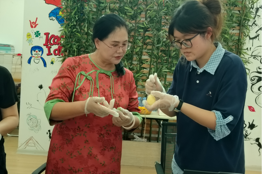 项目团队成员耐心指导参与者制作研磨皂