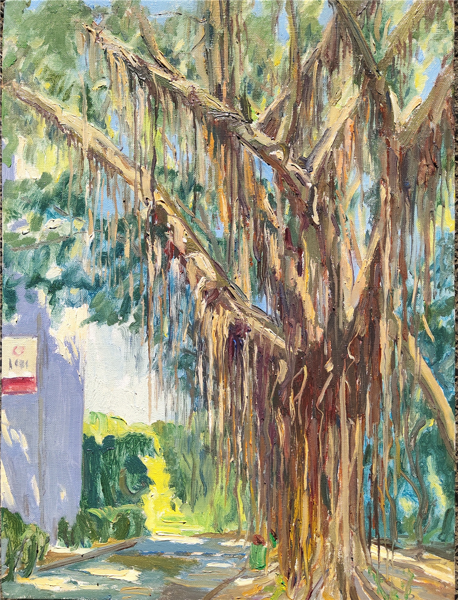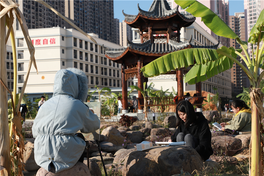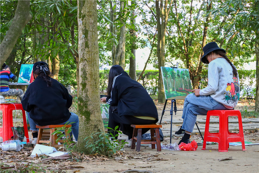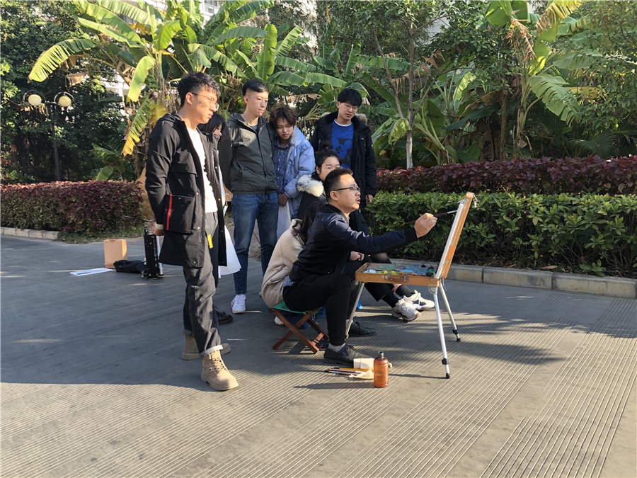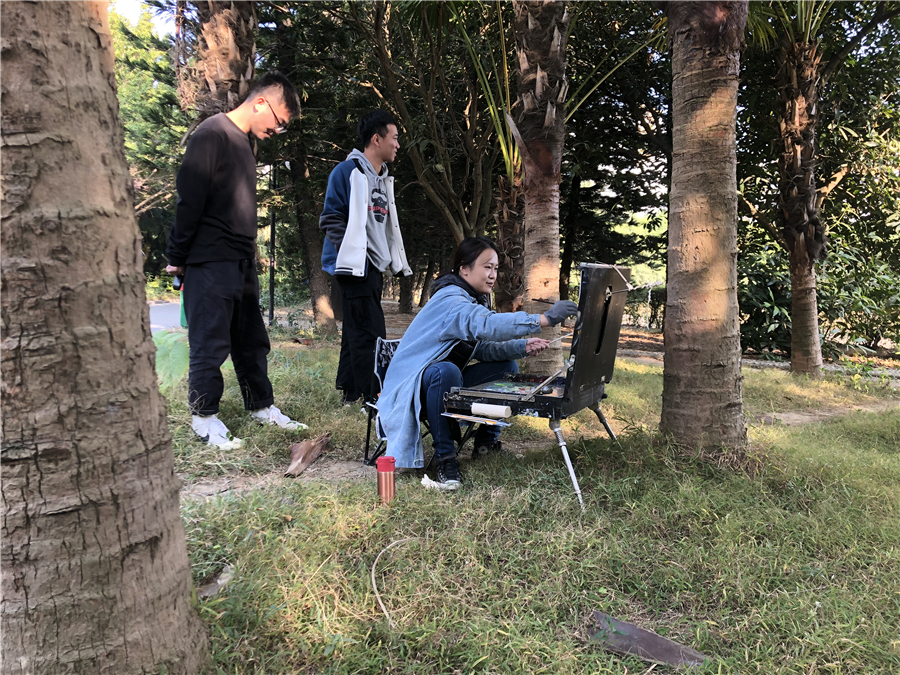 本次校园写生活动为期五天。师生分别集中在西校区取景作画,在东校区进行写生。 入冬后,空气中夹杂着丝丝冷意,北风也加快了南下的步伐,略带寒风,可是没有影响到同学们手中的画笔,他们或是坐在绿荫下,亦或是在校园路旁,三两成群,安静作画。