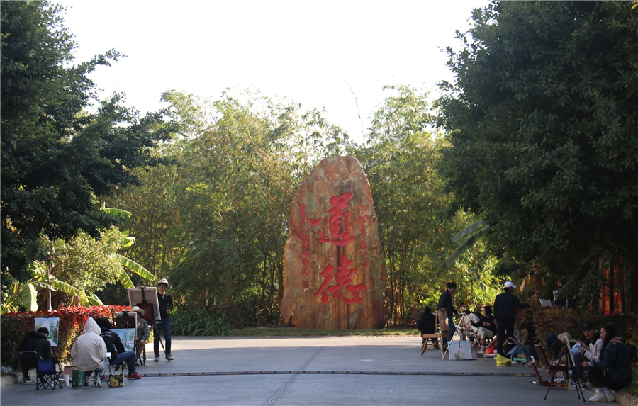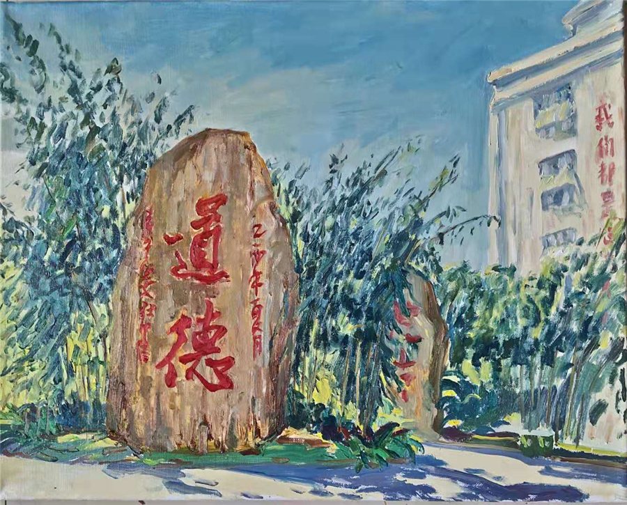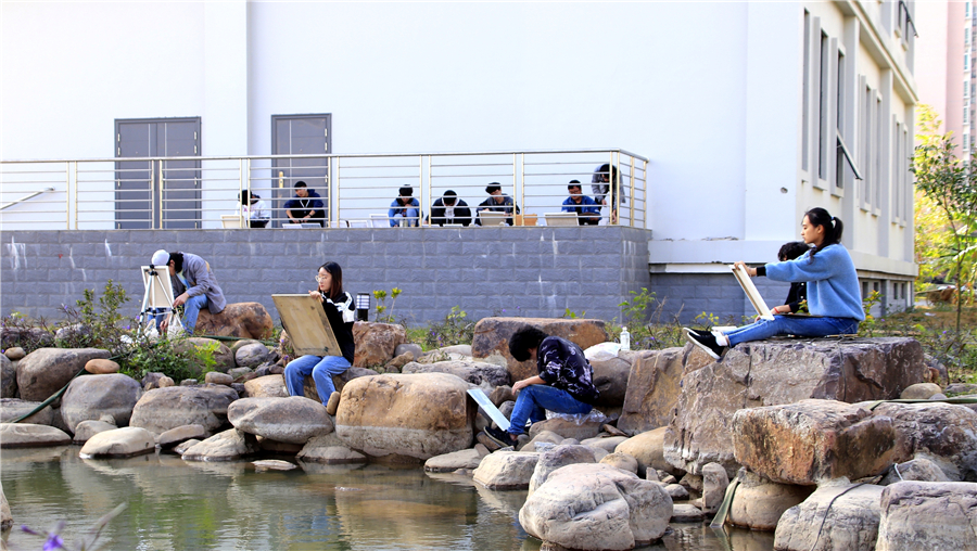 美术学院《风景写生》课程以校园风景写生为主要研究内容与实践方向,绘画过程围绕校园风景的色彩、构图展开,通过对校园选取适当的视角进行绘画表现,让同学们的目光更进一步的贴近校园,加深对学生对校园文化的理解。绘画过程既锻炼了学生们的构图和画面安排的能力,也培养学生对校园文化的认同情感,对绘画专业学生创作能力有很大的提高。比如学校的每一块石头的字样都有不同的涵义,通过写生实践活动,进一步加深了对北艺校园石头文化背后精神的理解。