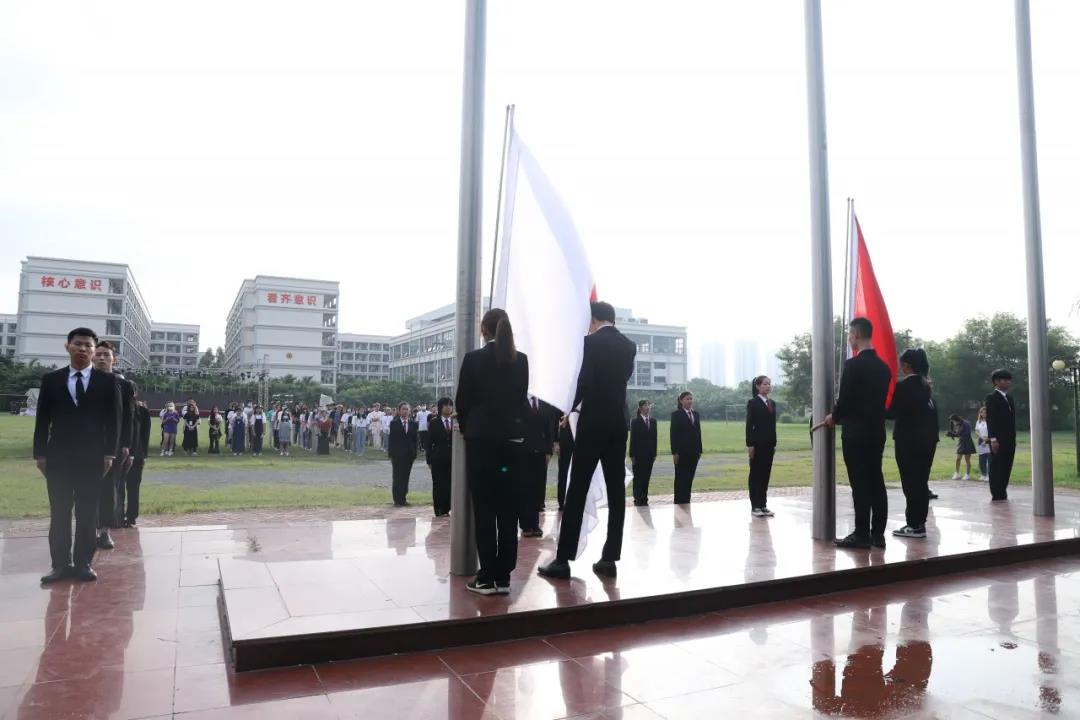 仪式第一项,旗手出旗。国旗护卫队迈着铿锵有力的步伐,护卫着国旗和校旗,走向升旗台。全体师生面向国旗和校旗,庄严肃立。